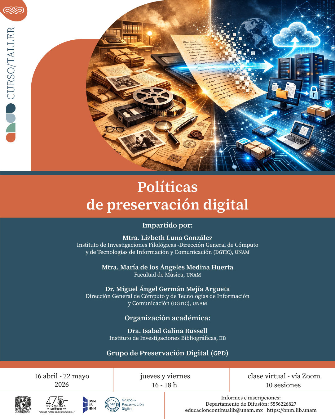 Inscríbete al curso/taller virtual de Políticas de preservación digital, organizado bajo la responsabilidad académica de Isabel Galina Rusell, del Grupo de Preservación Digital.