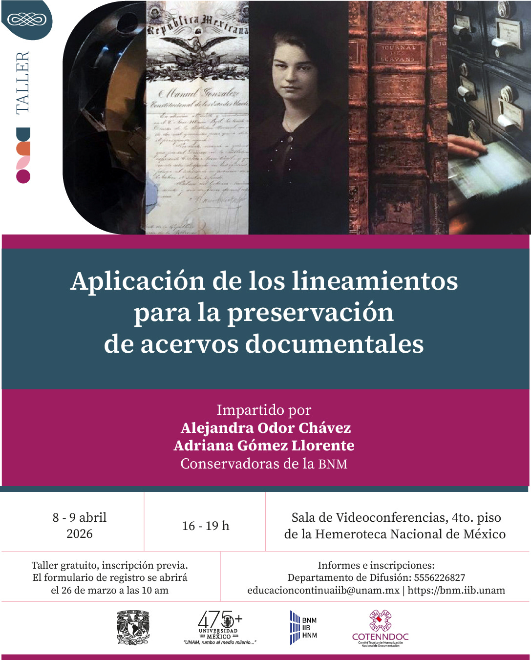 Inscríbete al taller de Aplicación de los lineamientos para la preservación de acervos documentales, impartido por Alejandra Odor Chávez & Adriana Gómez Llorente, conservadoras de la Biblioteca.
